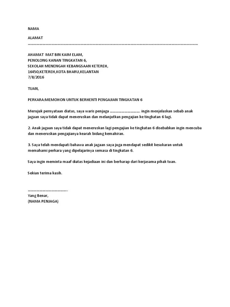 Contoh surat berhenti kerja dan surat perletakan jawatan yang lengkap oleh digital mukmin. Contoh surat berhenti kerja bahasa melayu picture places. Saya berbuat demikian adalah kerana ingin menyambung pelajaran. Penulisan surat ini diusahakan tidak ada kesalahan, dan usahakan untuk menata tulisan anda agar terlihat lebi rapi, sehingga pengoreksian akan lebih mudah dan mendapatkan nilai lebih tersendiri. Contoh surat notis mesyuarat agung author: